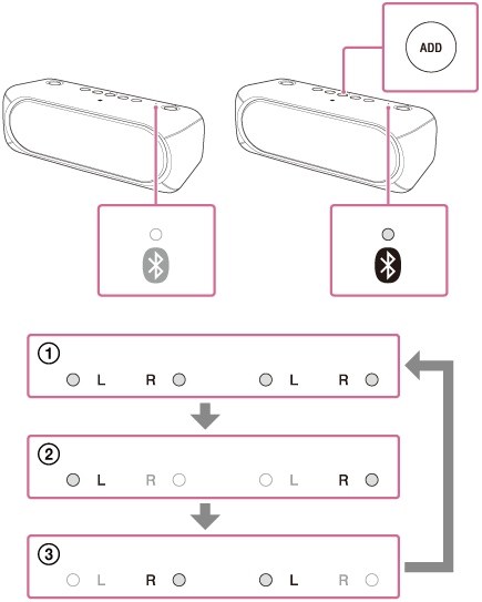2)、立体声模式(左声道/右声道):一个扬声器上的L指示灯和另一个扬声器上的R指示灯以白色点亮。