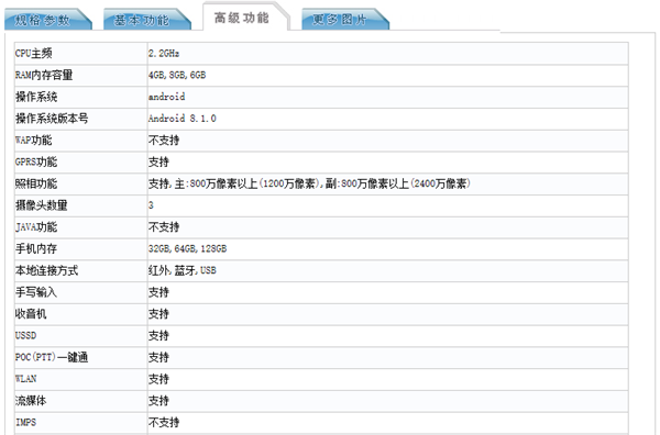 核心配置上,该机搭载八核处理器,CPU主频为2.2GHz,看来这款手机搭载的是骁龙710处理器,配备4/6/8GB内存+32/64/128GB存储,前置1200万像素摄像头,电池容量为3250mAh。