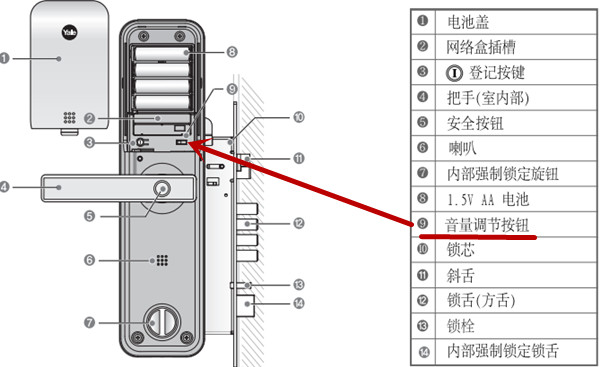 耶鲁智能锁的前面板和后面板不同,每款耶鲁智能锁的前面板几乎都有差距,但是所有的后面板都差不太多,这也让我们调节音量的操作变得简单了些。️耶鲁智能锁的提示音音量调节是由一个音量调节按钮控制的,这个按钮在智能锁电池盖板的下面。找到这个按钮,然后按下去,感受音量大小,觉得声音大小合适了再合上电池盖就行了,非常简单。(️一般耶鲁智能锁的音量有三个等级)