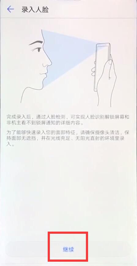 4、进入如下页面点击下方的【继续】即可录入人脸了,把手机正对着脸完成录入即可设置人脸解锁。