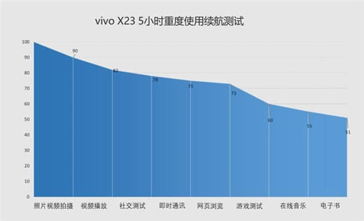 在五小时的重度续航测试中,vivoX23的续航表现完全撑的起日常生活使用需求,在经过一系列的耗电测试之后,vivoX23还剩下51%的电量。在日常生活中,用户的使用频次是要远远低于这个标准的,因此用户轻度使用一天是毫无问题的。