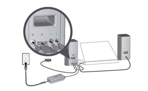 5、将电源组件的连接线插头插入到右侧扬声器上的 DC POWER(直流电源)插孔。