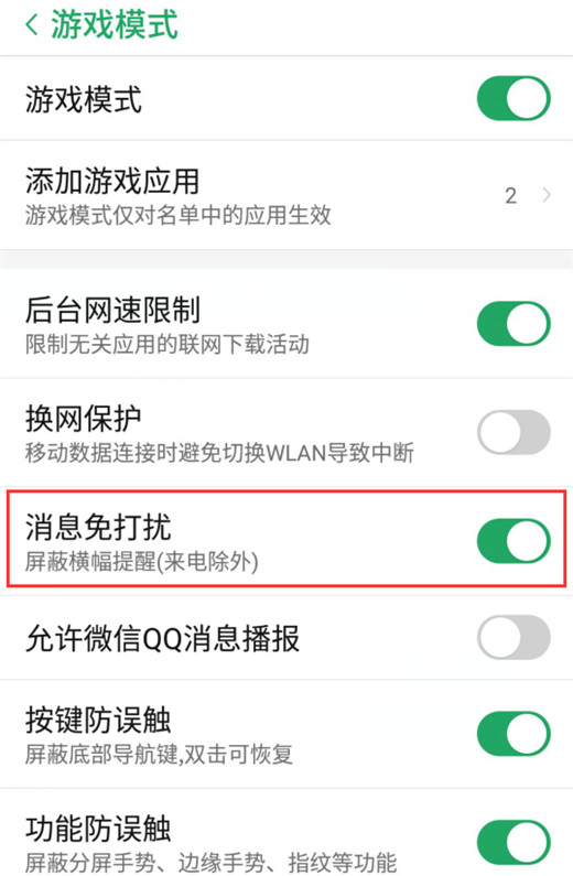 第三步:找到【消息免打扰】选项,打开右边的开关,打开消息免打扰之后,玩游戏会自动屏蔽消息提醒,来电消息除外。