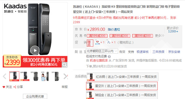 凯迪仕K9指纹锁价格凯迪仕K9指纹锁目前在京东商城️售价是2899元,但是可以满599减300,也就是说,这款凯迪仕️K9指纹锁到手价是2599。不过小编觉得如果您真打算买这款锁的话您可以再等等,在️9月4日0点开抢,到手价只要2399!这是一个疯狂的价格!