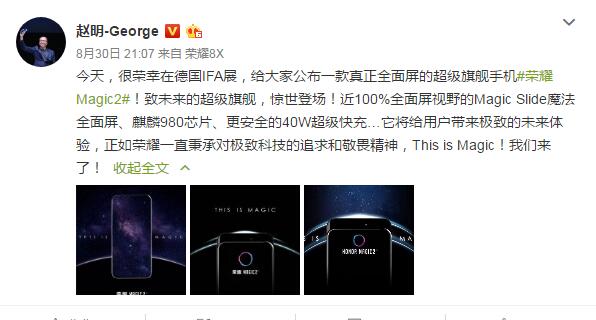 荣耀magic2是什么处理器?荣耀的业务部总裁在昨晚的IFA展上已经明确说出荣耀magic2将采用麒麟980芯片,成为首款确认将搭载麒麟980芯片的旗舰手机!大家有没有一点小期待!