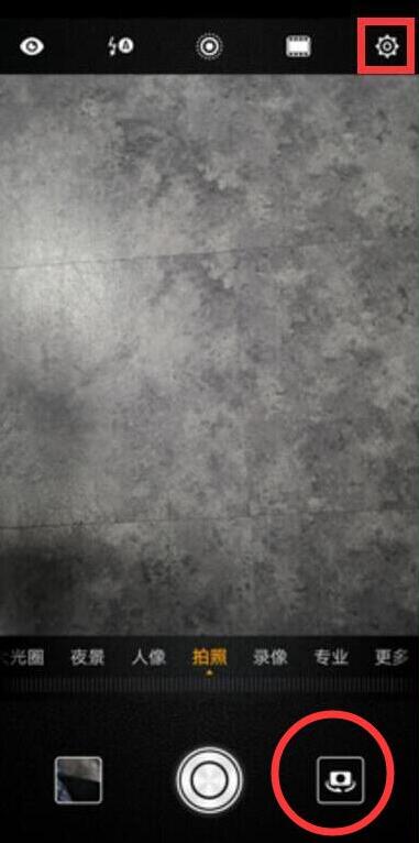 2、点击右下角按钮切换至后置摄像头,再点击点击右上角的“设置”图标,