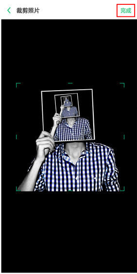 7、选取好图片后,会进入到图片裁剪界面,拉动裁剪框来选取你想要设置为通话背景的部分,裁剪完成后点击右上角完成。
