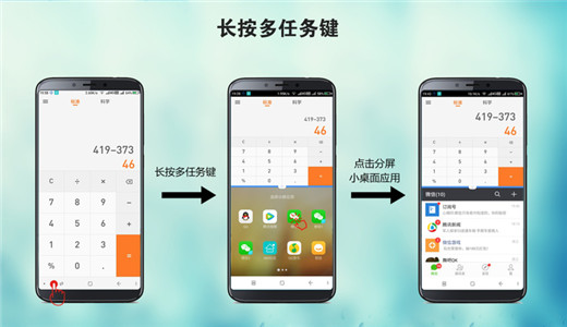 打开应用长按任务键即可以开启分屏,进入分屏小桌面,从分屏小桌面选择与之分屏的应用实现分屏,如图: