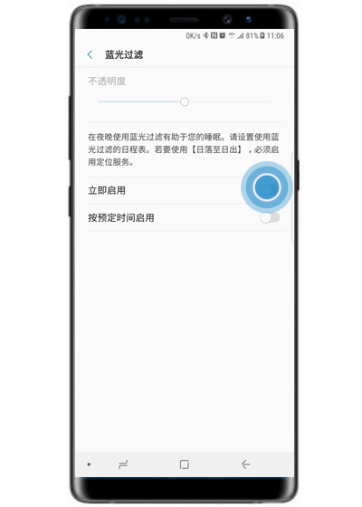 点击【立即启用】右侧滑块开关,蓝色代表开启。我们可以根据自己的需求设置不透明度以及按预定的时间启用。