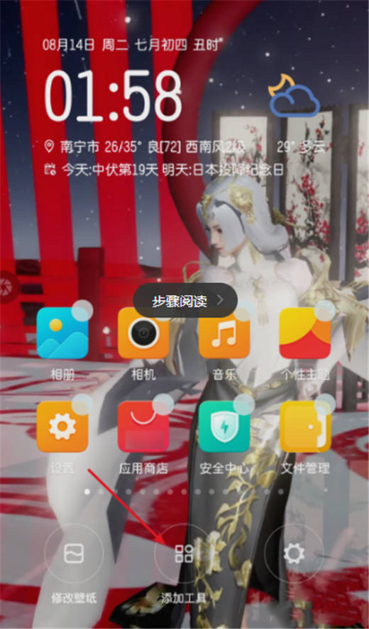 首先我们进入手机的桌面,长按桌面空白处即可进入桌面编辑模式