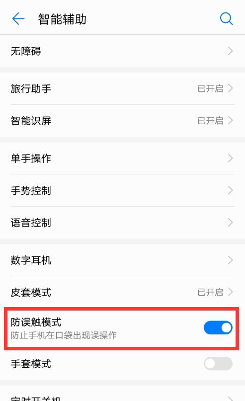 3、在智能辅助的页面我们就可以找到【防误触模式】,点击打开或关闭后面的开关即可打开或关闭防误触模式。