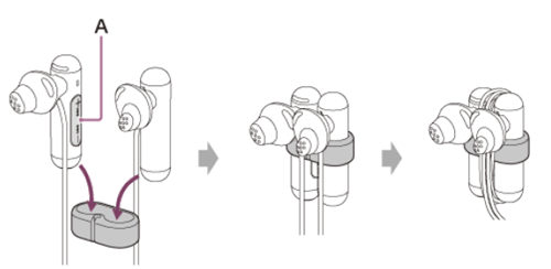 如下所示将“+”和“-”按钮(A)朝内放置,并将耳机线从两边耳机之间缠绕。