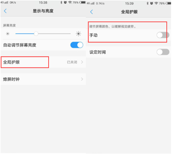 进入全局护眼,开启全局护眼屏幕颜色会散发黄色的光,打开手动即可。