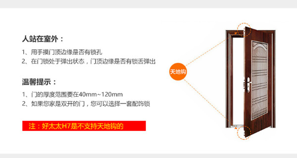 好太太的指纹锁产品质量在消费者心中也是非常信得过的,但是有些朋友还是会问这样的问题——好太太H7指纹锁支持天地钩吗?今天就让小编来帮您解答吧!