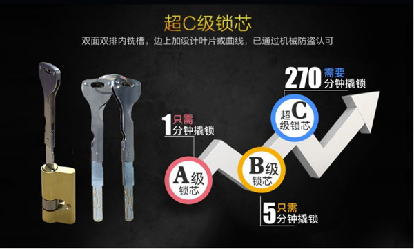 这款好太太H7指纹锁使用的是超C级锁芯,防撬锁时间长达270分钟,如果您觉得这样还是不安全的话,那小编再给您看看它的锁芯结构。