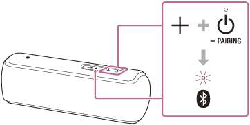 按住+(音量)按钮的同时,按下【电源】按钮/ -PAIRING按钮直到【BLUETOOTH】指示灯以蓝色闪烁。