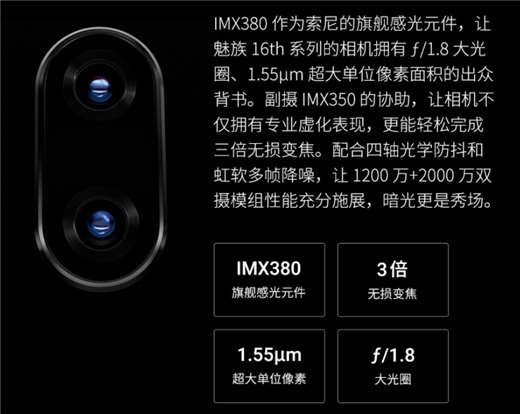 魅族16摄像头有光学防抖吗魅族16后置摄像头使用1200万+2000万像素双摄组合,使用索尼的IMX380+IMX350传感器,IMX380拥有1200万像素,CMOS尺寸为1/2.3英寸,单像素面积达到1.55um,摄像头拥有f/1.8大光圈,支持四轴光学防抖,支持PDAF相位对焦和激光对焦,使用经典的环形LED补光灯。