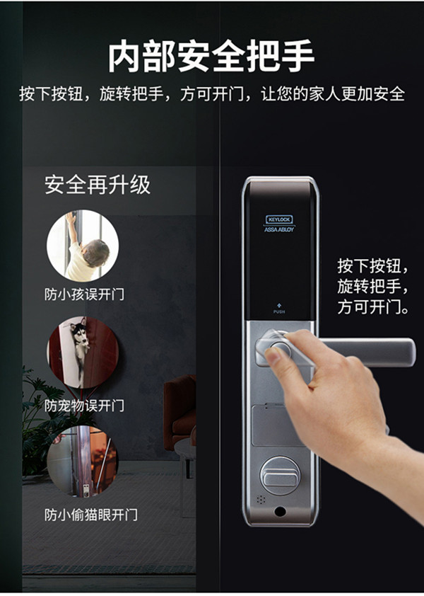 3.内部安全把手,按下按钮旋转才可开门,防止小孩、宠物误开门;