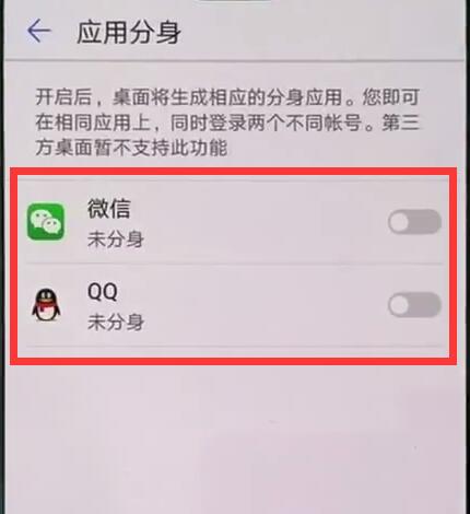 4、进入如下页面就可以点击打开应用右侧的开关来打开应用分身了,目前只支持微信和qq分身。