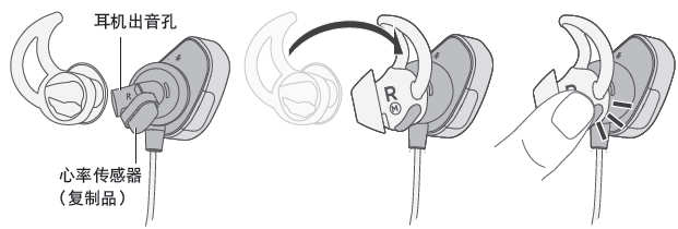 注意: 确保心率传感器(左耳塞)和心率传感器复制品(右耳塞)插入到耳塞尖部轮廓。