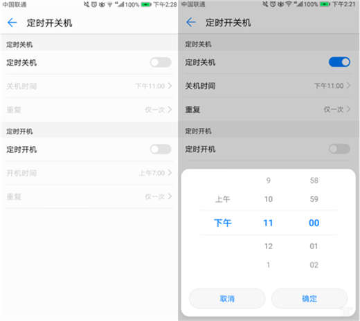 开启定时关机后,会出现“关机时间”和“重复”两个选项卡,点击关机时间,在底部弹框中可以滑动选择时间,点击确定即可。