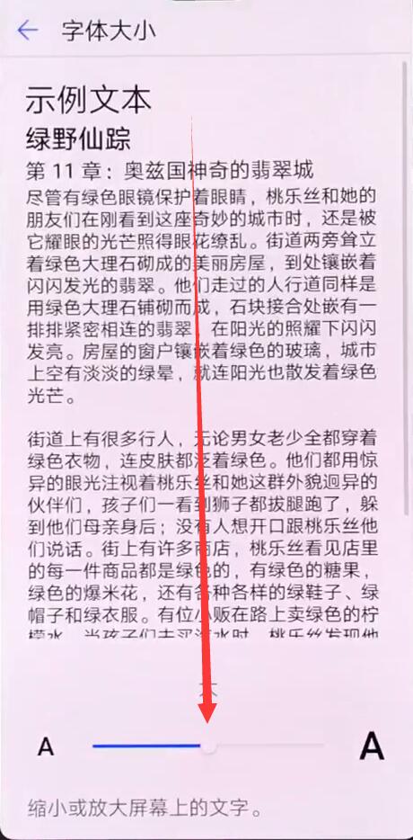 4、进入如下页面,我们就可以依照上面的示例文本,左右滑动屏幕下方的滑块来调整手机字体大小了!