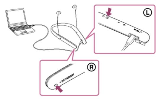 重置耳机如果耳机无法打开,或即使打开也无法操作,则使用附带的Micro-USB连接线将耳机连接至已启动的电脑,然后同时按下电源按钮和NC/AMBIENT按钮。耳机将重置。配对信息不会删除。