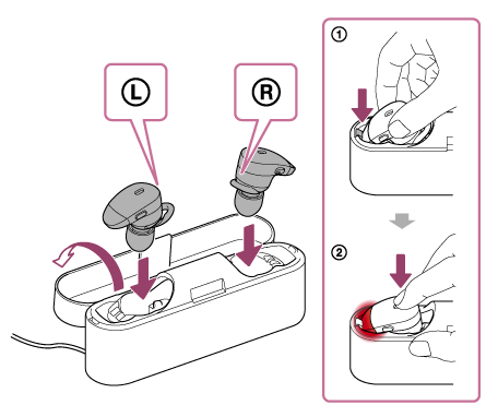 1.按图示显示的顺序(【1】,然后【2】)放置右侧和左侧单元。插入【R】右侧单元和【L】左侧单元,直至其插入到位,并确保单元锁定在充电盒中。