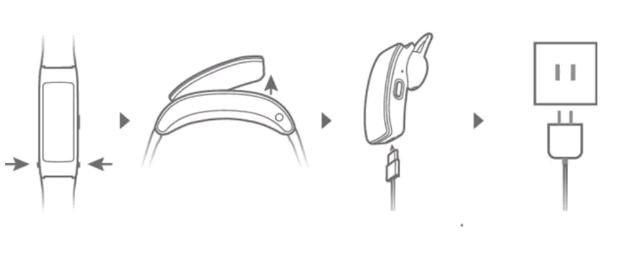 b.手环未配备充电器,充电器规格可以是5V/0.5A、5V/1A、5V/1.5A、5V/2A,不建议使用移动电源进行充电。