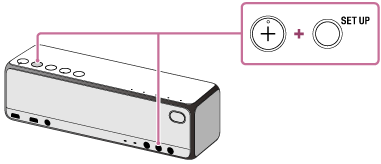 2、扬声器已经打开时,同时按住顶部的+(音量)按钮和背面的SET UP按钮超过4秒钟,对扬声器进行初始化设定。