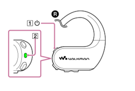 开启NW-WS623耳机按住按钮【1】3秒钟。您将听到启动音。当NW-WS623耳机开启时,指示灯【2】将亮起。