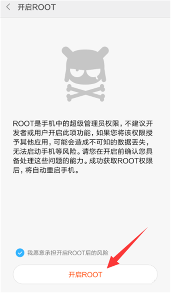 在“开启root权限”界面中,勾选【我已阅读】项,点击【开启root】按钮即可进入root开启界面。