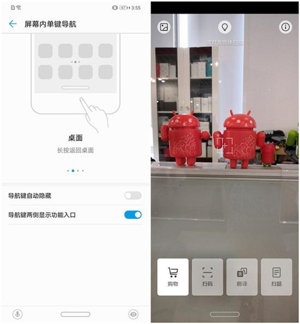 对于单键导航的交互方式,可以分为轻触返回、长按进入桌面、左右滑动开启多任务,语音助手和扫一扫功能则是分别布置在内置单键的俩侧。右边的眼睛形状图标,主要功能是扫一扫,左边的则是语音助手。