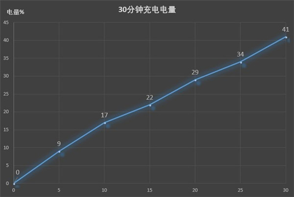 ️30分钟充电测试:在手机电量为0的情况下,关闭所有后台应用进行30分钟充电,每5分钟记录一次电量。下面,我们看一下续航测试结果: