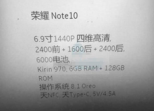 根据这位网友的爆料,️荣耀note10的屏幕尺寸为6.9寸,前置摄像头像素为2400万、后置1600万+2400万双摄,搭配6GB的运行内存和128GB的手机储存,还支持有NFC功能。
