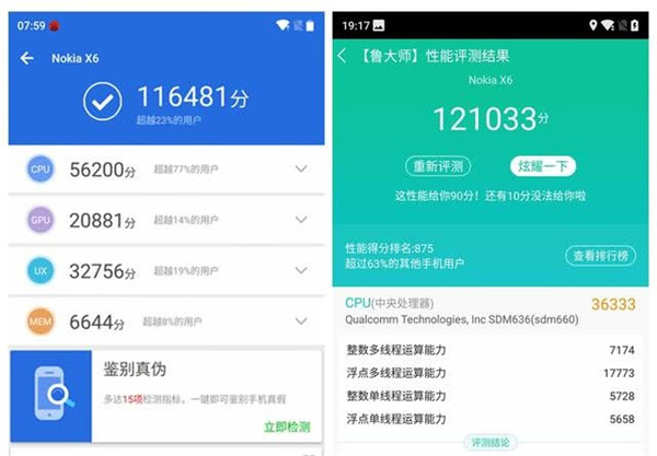 从跑出实测来看,诺基亚X6安兔兔跑分超过了11万分,鲁大师得分超过了12万分,这个跑分成绩远高于去年千元机流行的骁龙625手机,相比跑分14万分左右的骁龙660手机要差一些,与骁龙820(前年旗舰CPU)已经十分接近。