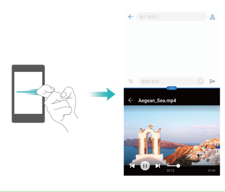 注:在某些应用界面,如【手机管家】、【主题】、【支付保护中心】等不适用分屏功能。在这些应用界面使用指关节或长按最近键启动分屏时,会显示“该应用不支持分屏”的文字。