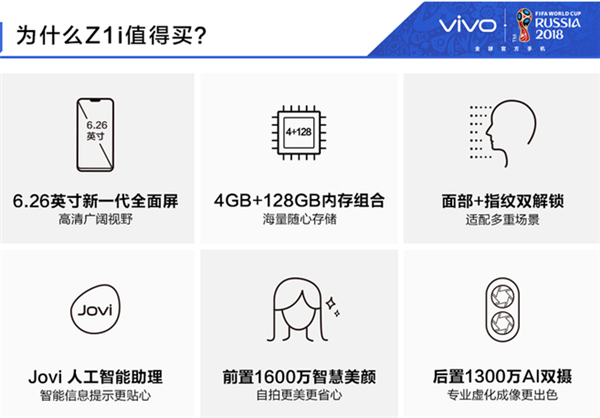 在拍照方面,vivo Z1i在后置摄像头方面与Z1保持了一致,均为1300万像素+200万像素双摄,前置摄像头在Z1I上略有升级,为1600万像素,不过同为2400万感光单元,均支持AI摄影功能。Jovi人工智能助理也搭载在vivo Z1i上。同时Z1i还拥有Face Wake面部识别及指纹识别两种方案,面部识别解锁更方便,指纹识别支付更安全。