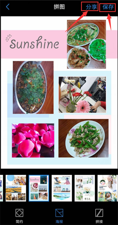 5.点击【开始拼图】之后,会看到有️【简约】【海报】【拼接】三种拼图方式,可以自由选择,小编这里选择了️海报哦,然后在选择自己想要的海报形式并拖动图片就可以啦,完成之后点击️分享或保存。