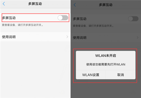 第二步:将【多屏互动】开关开启,这时候会弹出一个提示框,进行WLAN设置即可,打开之后手机会自动搜索支持WLAN Display功能的设备。