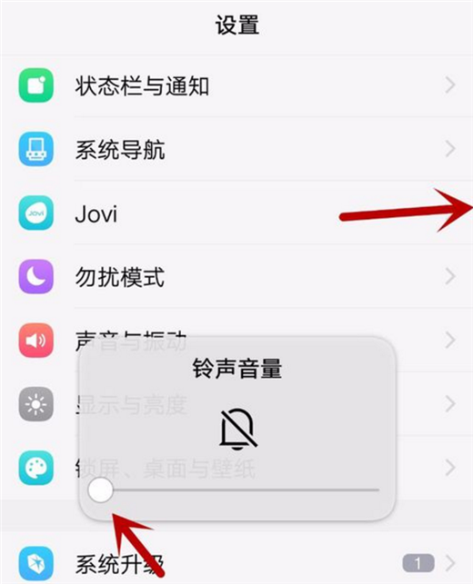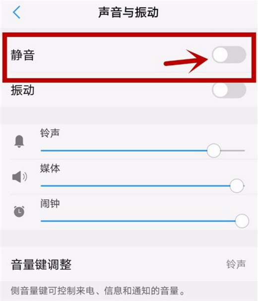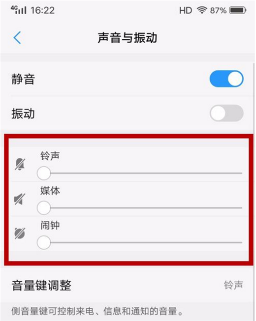 之后我们我们可以看到铃声、媒体、闹钟击中声音的设置,我们将铃声声音移动到最左侧,将声音关闭,我们截图的时候就不会有声音啦,如图所示。