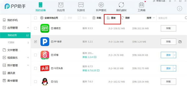 1、在电脑端或手机端下载PP助手来解决这个问题,如下载电脑端PP助手,进入应用管理,选中需要修复的应用图标,点击选择【重装】即可解决问题,如下图所示。
