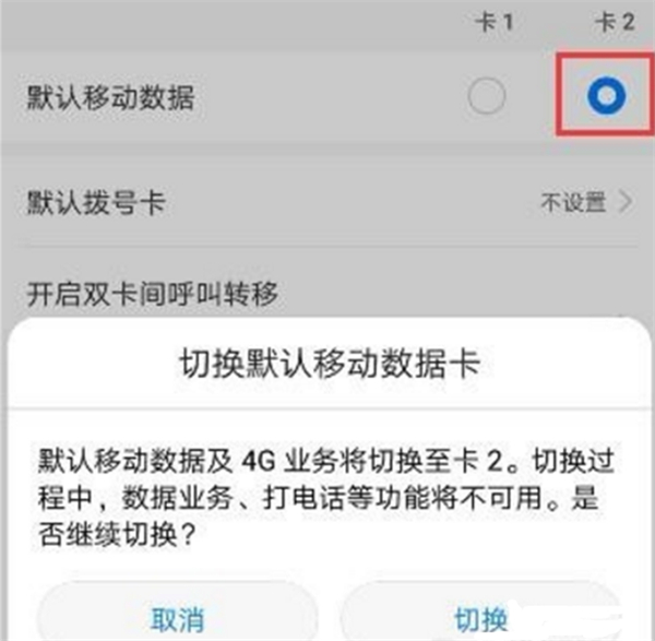 在切换之前我们先确认一下现在是使用的哪张卡的移动数据,选择卡2,点击切换,切换的时候手机的所有信号连接都会断开,过几秒钟就发现已经切换到卡2了。