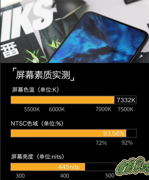 这块屏幕采用了三星的SuperAMOLED材质,值得注意的是,这块屏幕采用了P3色彩管理技术,色域更广。我们用TopconBM7A亮度色度仪分别测试这块屏幕的亮度、色域和色温,得到如下结果。