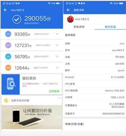 通过测试得知vivo NEX安兔兔跑分为29万+,这样的成绩实属罕见。