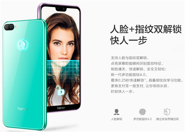 荣耀9i新机支持人脸与指纹双解锁,点亮屏幕即能瞬间识别面部特征,刷脸通关,快速解锁。实际体验解锁速度,当你眨眼的瞬间,荣耀9i屏幕就已经解锁,也就是说它的人脸识别比正常眨眼的速度还要快。摘带眼镜也不影响解锁速度。指纹解锁方案采用新一代多功能指纹4.0,最快0.25秒快速解锁, 具备指纹自学习功能,支持支付宝一指支付。