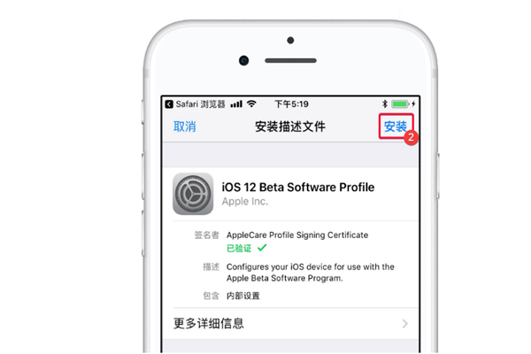 2、接下来会弹出安装描述文件的界面,点击右上角“安装”,输入设备“锁屏密码”后按提示完成操作并重启设备;