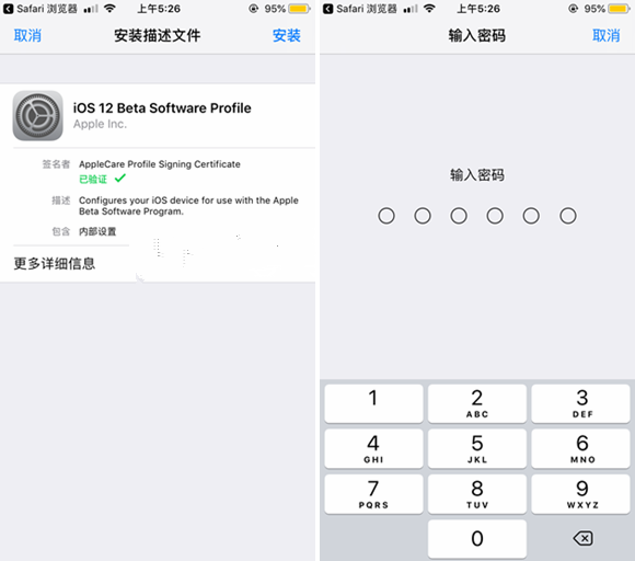iOS 12升级方法步骤:第一步:首先在iPhone中下载苹果官方提供的iOS12描述文件,描述文件下载链接可以关注公众号{xiaowangsm},进入公众号之后回复消息【描述文件】即可自动获取下载链接,复制链接用iPhone自带的Sairi浏览器打开这个链接,之后在安装界面,点击右上角的“安装”,点击安装之后需要我们输入iPhone解锁密码,如下图所示。