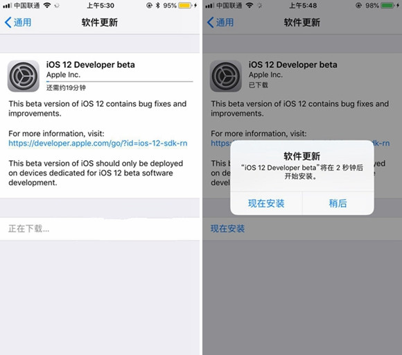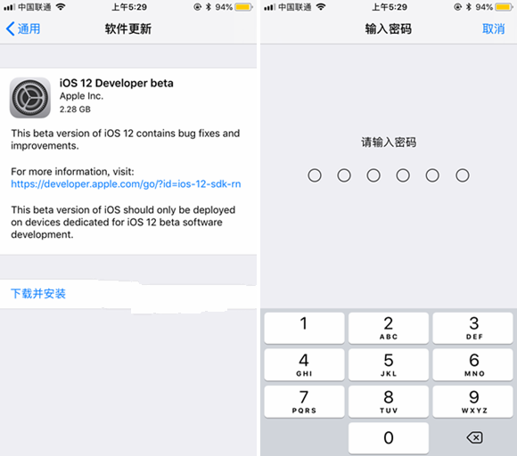 第三步:重启设备之后,进入系统,我们依次进入“设置”---‘通用’----“软件更新”,我们会发现软件更新页面有了iOS12预览版的推送固件,我们可以点击【下载安装】,然后需要我们再次输入解锁密码,如下图所示。