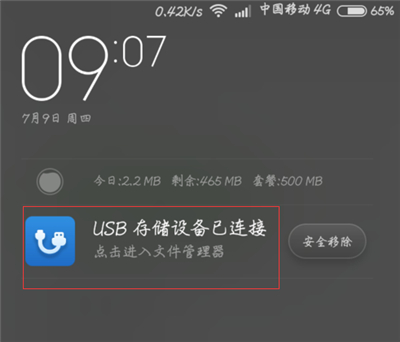 1.用OTG线将手机和USB设备连接后,下滑【通知栏】,打开【USB存储器】,现在就可以使用USB设备了。